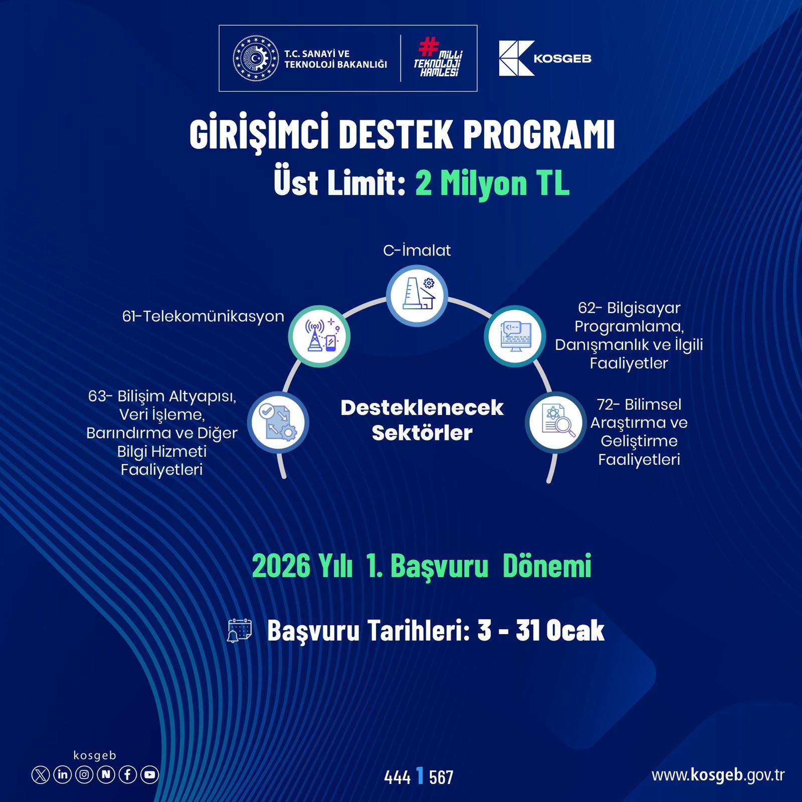 İş kurma, iş geliştirme ve faiz desteği olmak üzere üç ana kalem üzerinden yürütülen destek sürecinde imalat ve bilişim gibi alanlara öncelik verilmekte ve girişimcilerin finansmana erişimini kolaylaştırarak Türkiye’nin ekonomik geleceğinde rekabetçi ve dijital dönüşüme uyumlu bir işletme yapısı kurmayı hedeflemektedir. Başvuru için son tarih 31 Ocak 2026.